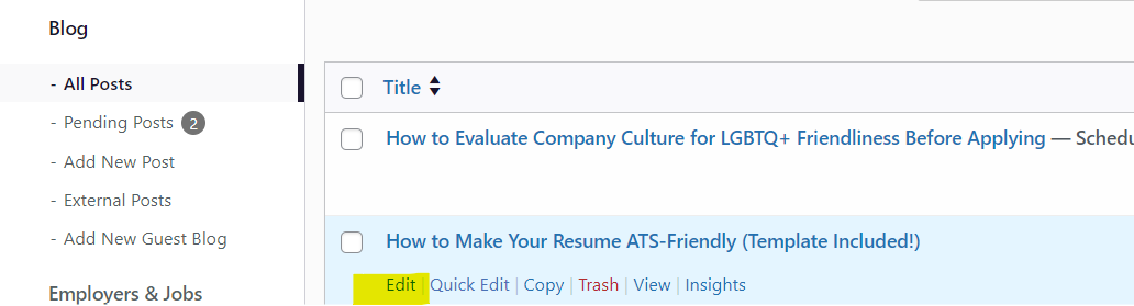 To edit the author of a blog post, select “Publish” and then “Blog” from the left side of your dashboard. This will display your list of blogs. Hover over the blog post that you would like to change the author of, and select “Edit.”