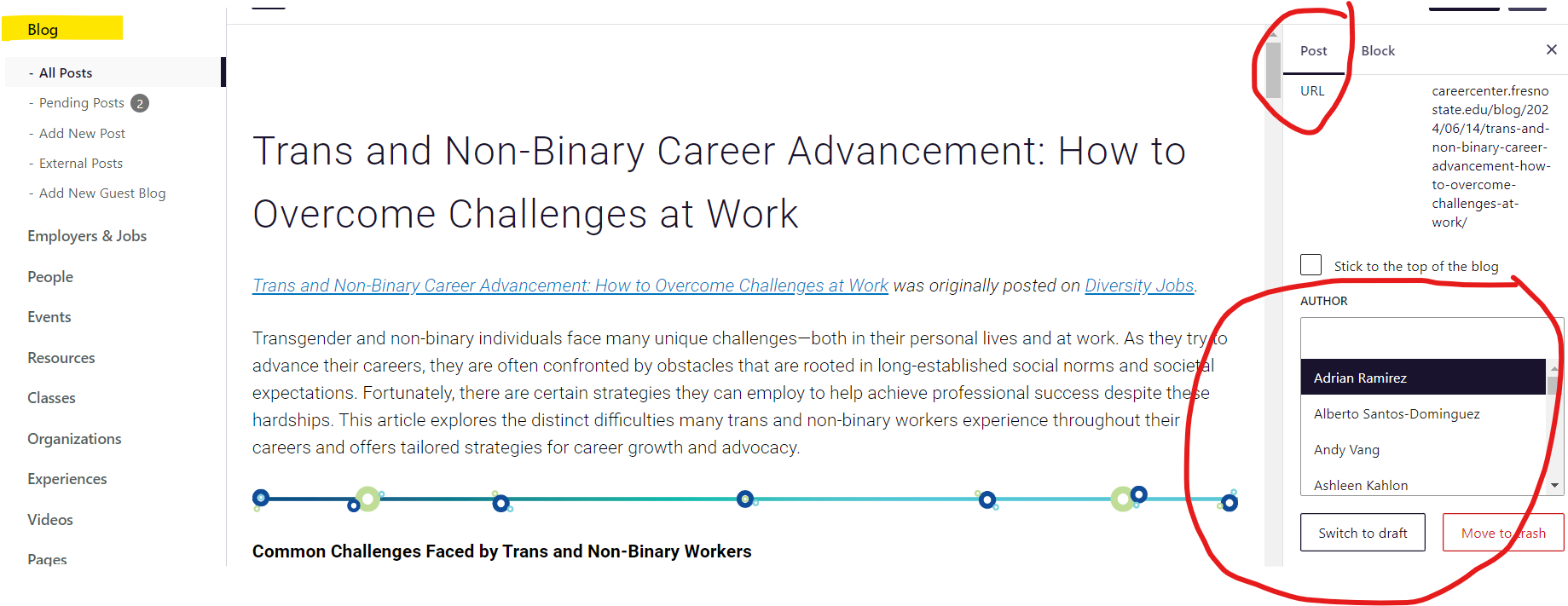 From within the blog edit feature, click on the "Post" menu settings on the right side and you will see an “Author” dropdown section, where you can select an author for your blog. This dropdown will be populated with the Admin, Staff and Student Staff Users from your site. If there is a person that you would like to be the author, but they are not showing in the dropdown, confirm that they are listed in the Users section as either Admin, Staff or Student Staff.