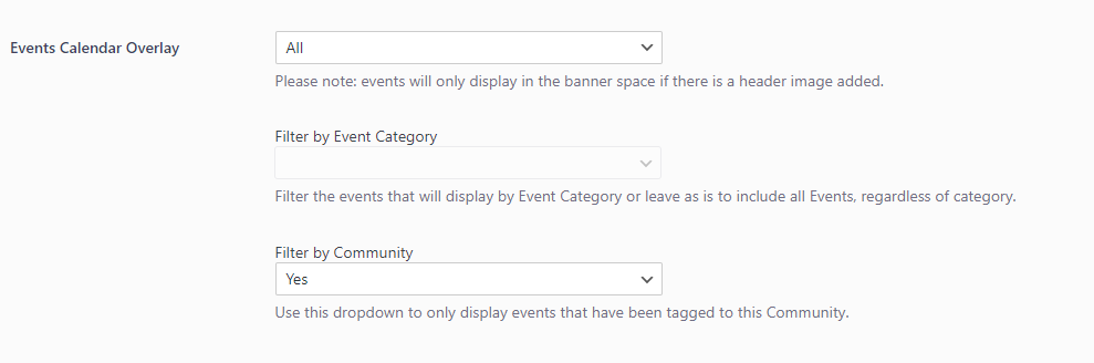 Activating the Events Calendar Overlay on a given Community means that when you have a header image added at the top of your Community, events can display over that image, on the right-hand side. To top it all off, these events can be pre-filtered to just display events tagged to this Community to really lean into the Community personalization.
