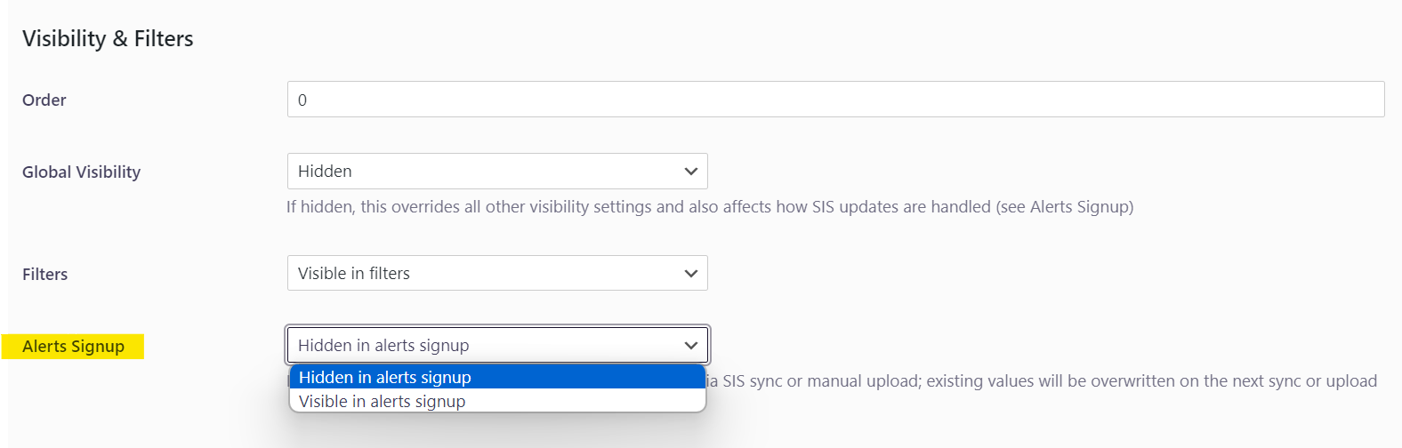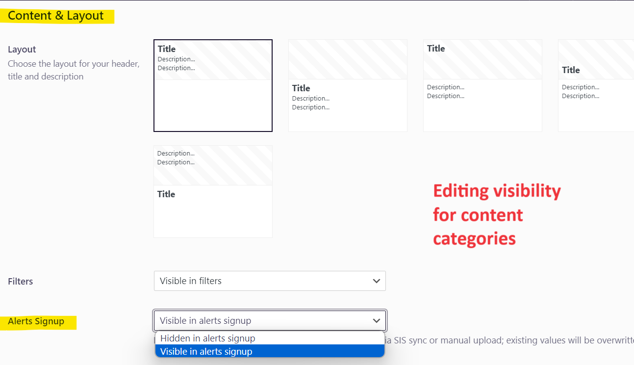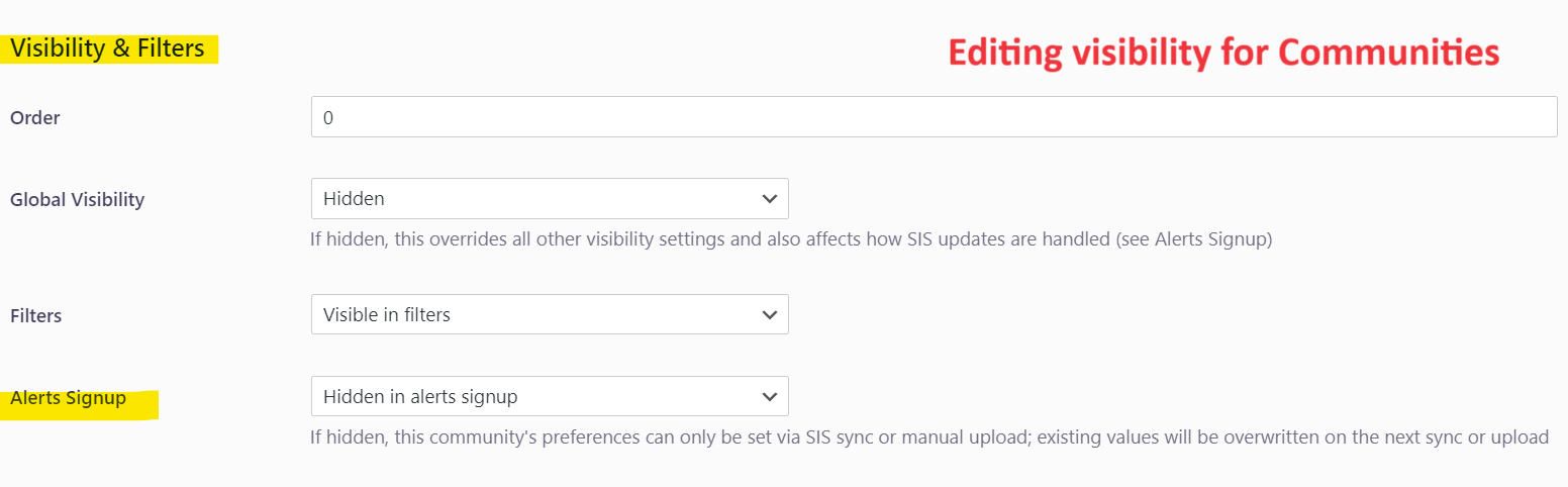 Step 4: Under "Alerts Signup" select the option from the dropdown that reads: "Hidden in alerts signup." This will hide this Community or Content Category from appearing! Then you're done!