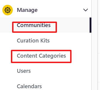 Step 1: Navigate to Manage and click on Communities to hide certain Communities or Content Categories to hide certain Content Categories.