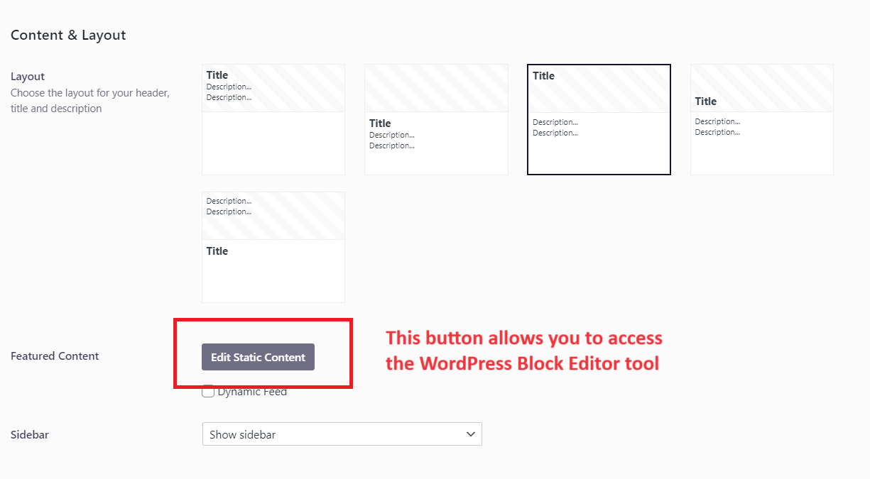 2) Under Content & Layout, the "Edit Static Content" button which allows you to access the WordPress Block Editor for more advanced content editing