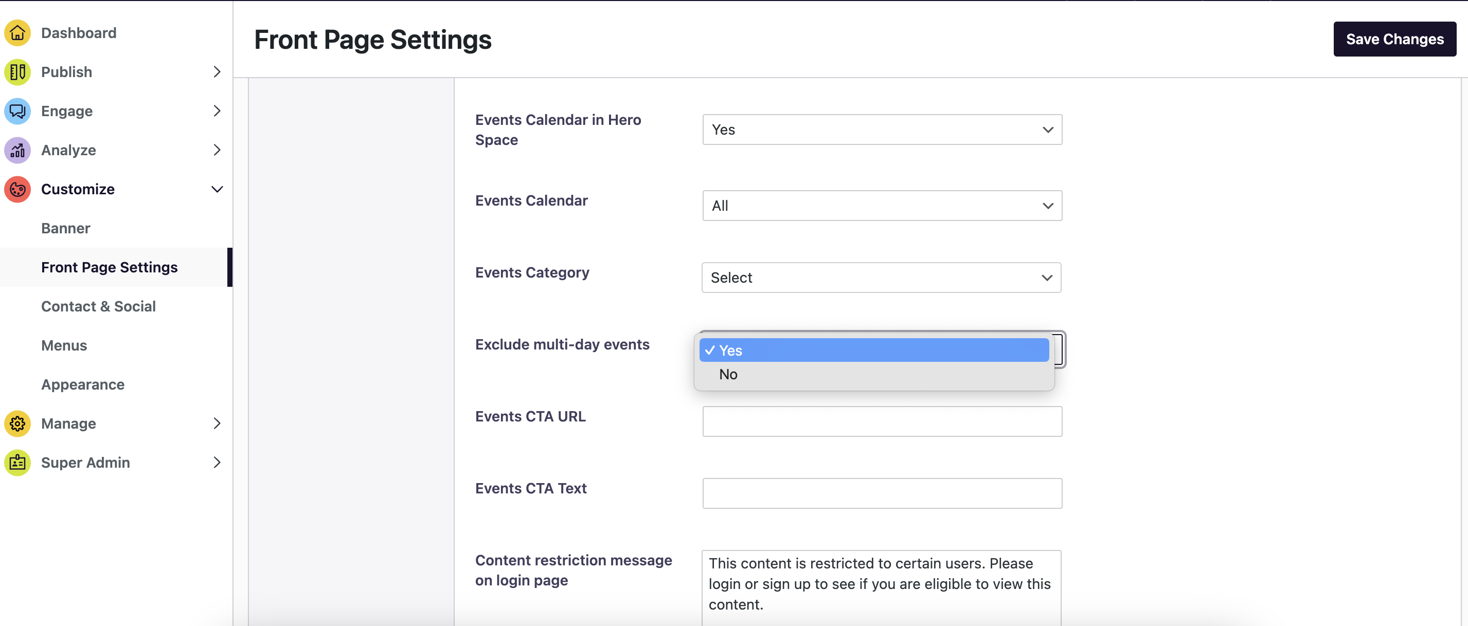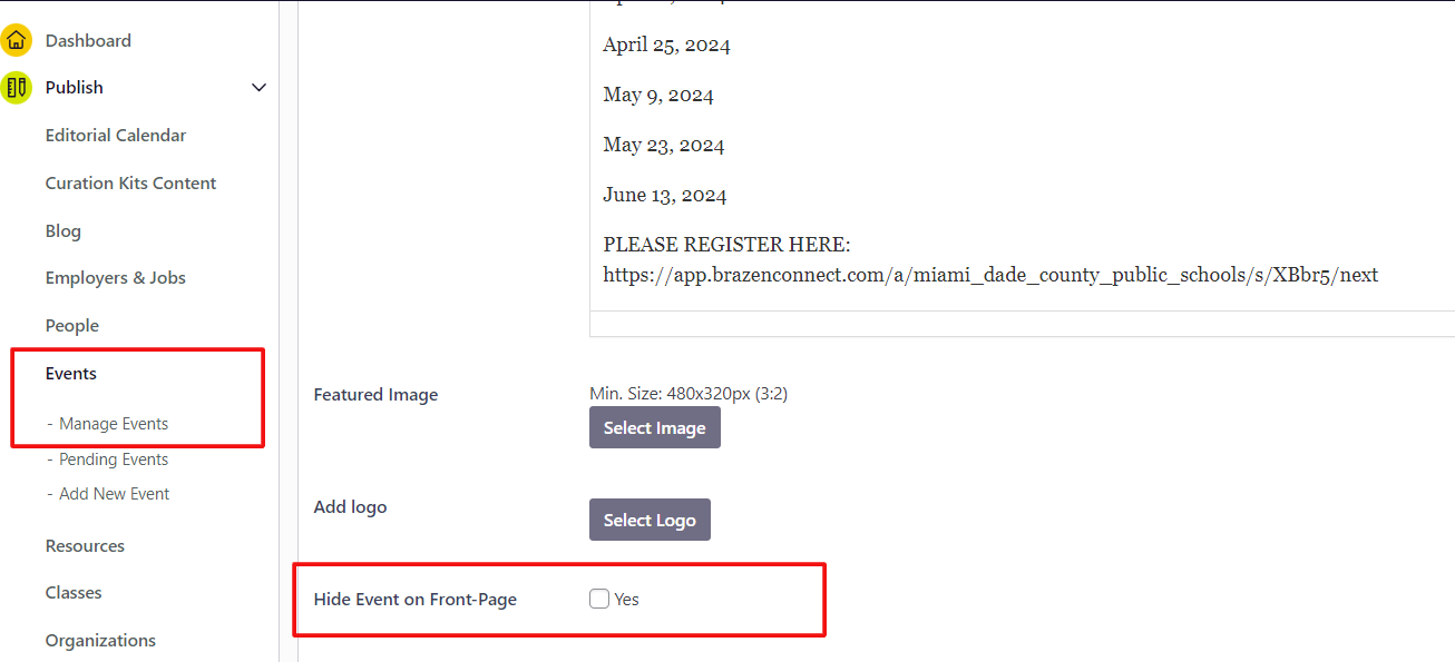Note: this only affects the front page Events widget that overlays on your front page banner. This would not affect other Event widgets on the lower part of your front page or throughout your uConnect pages/platform.