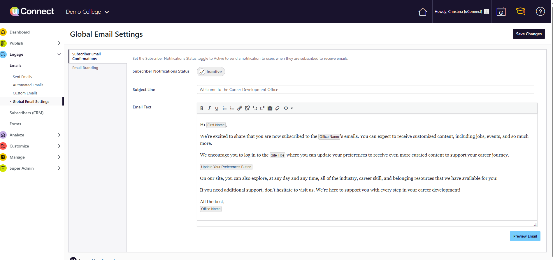 Toggle the subscriber notification status to Active. Once enabled, any subscriber who is uploaded to your platform and opted into automated emails will automatically receive this confirmation email — sent from the Career Center email address you have configured in uConnect.